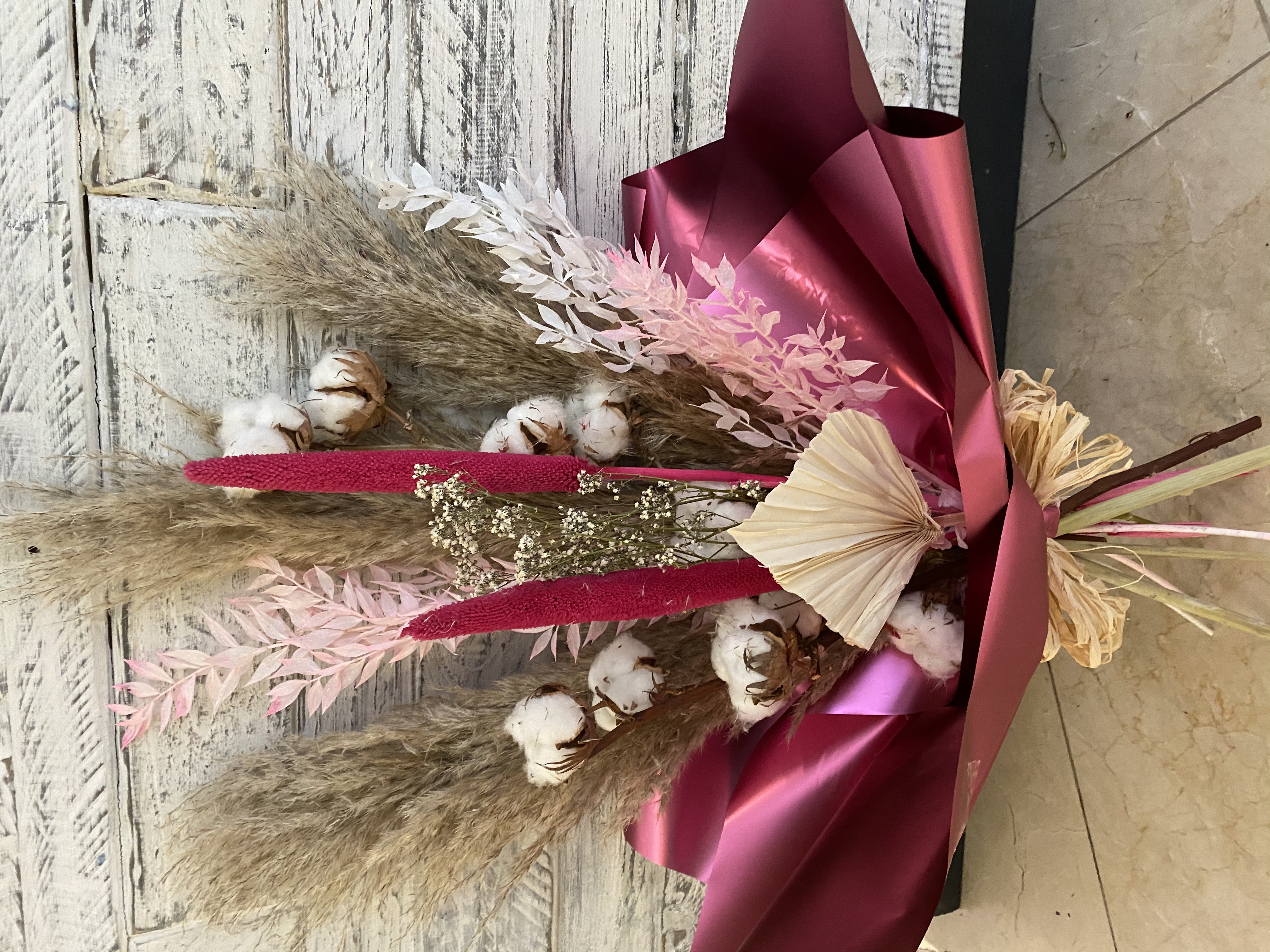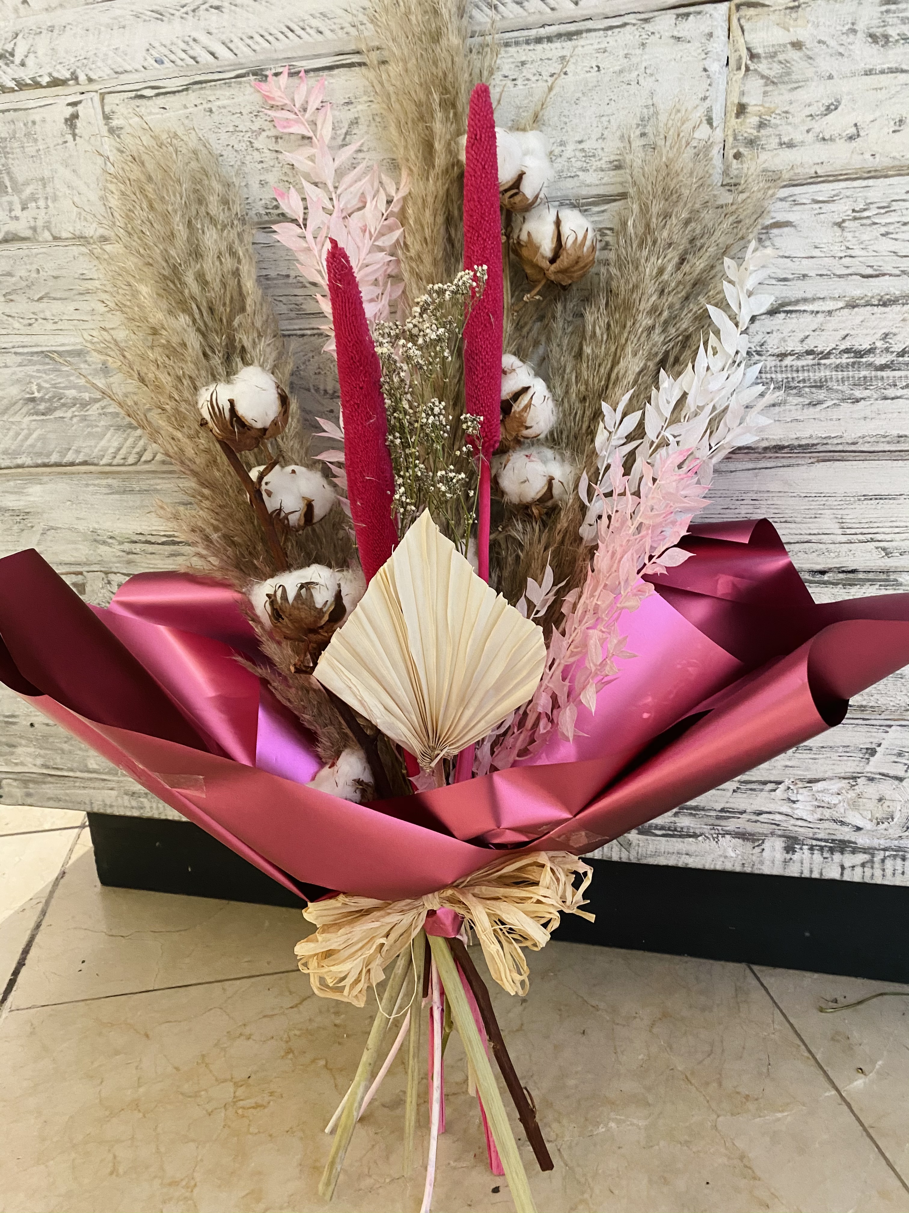 Handmade using a lovely selection of dried and preserved flowers in a mix of natural, pink & whites. All handtied together in a stunning pink wrap & finished with a bow!