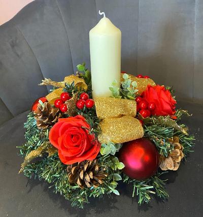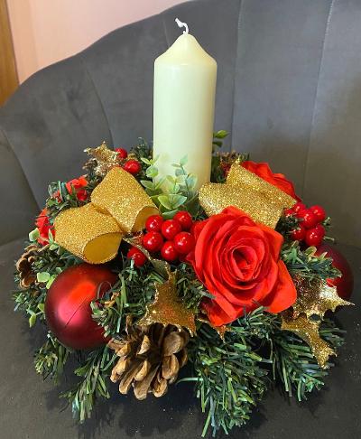 This festive artificial table arrangement has been hand made by a member of the Enchanted Rose team using a mix of artificial Roses & Spruce with added decorative ribbons, Christmas berries, festive pinecones & cinnamon sticks.