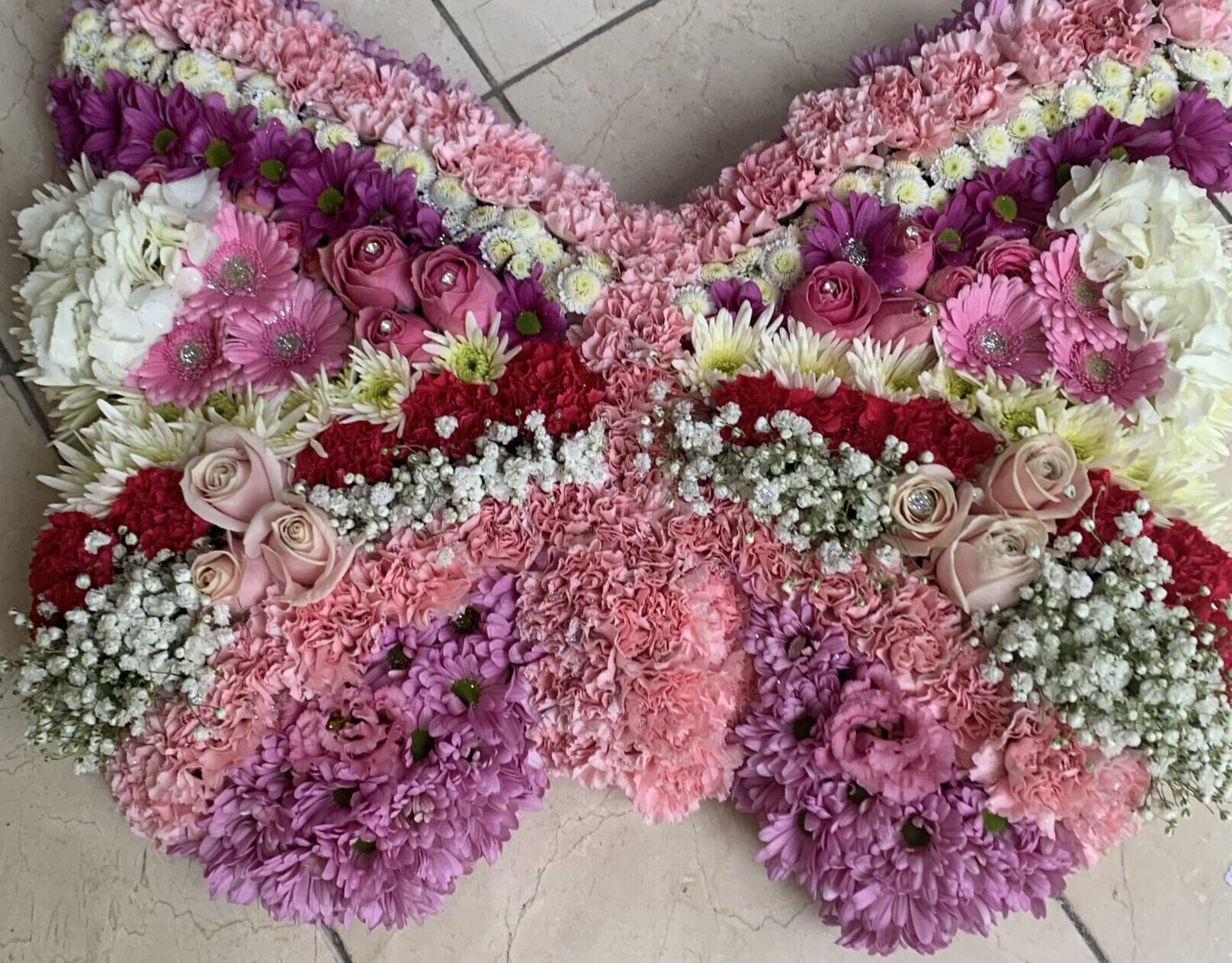 Funeral Butterfly Flower Tribute is covered in an array of mixed flowers. In colours of your choice made in a beautiful butterfly shape design for you for your loved one’s funeral.