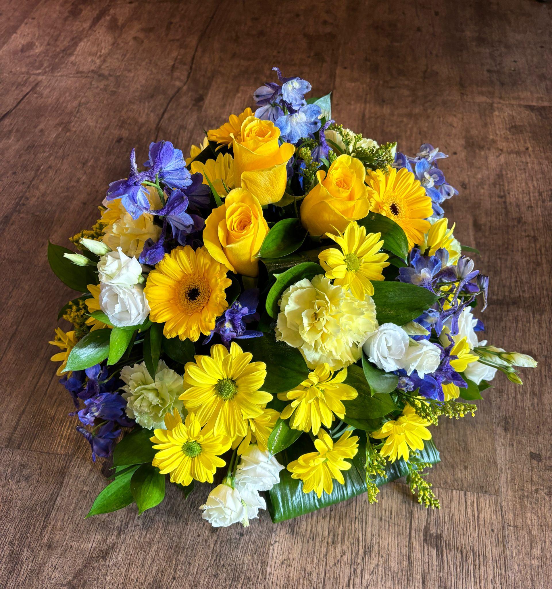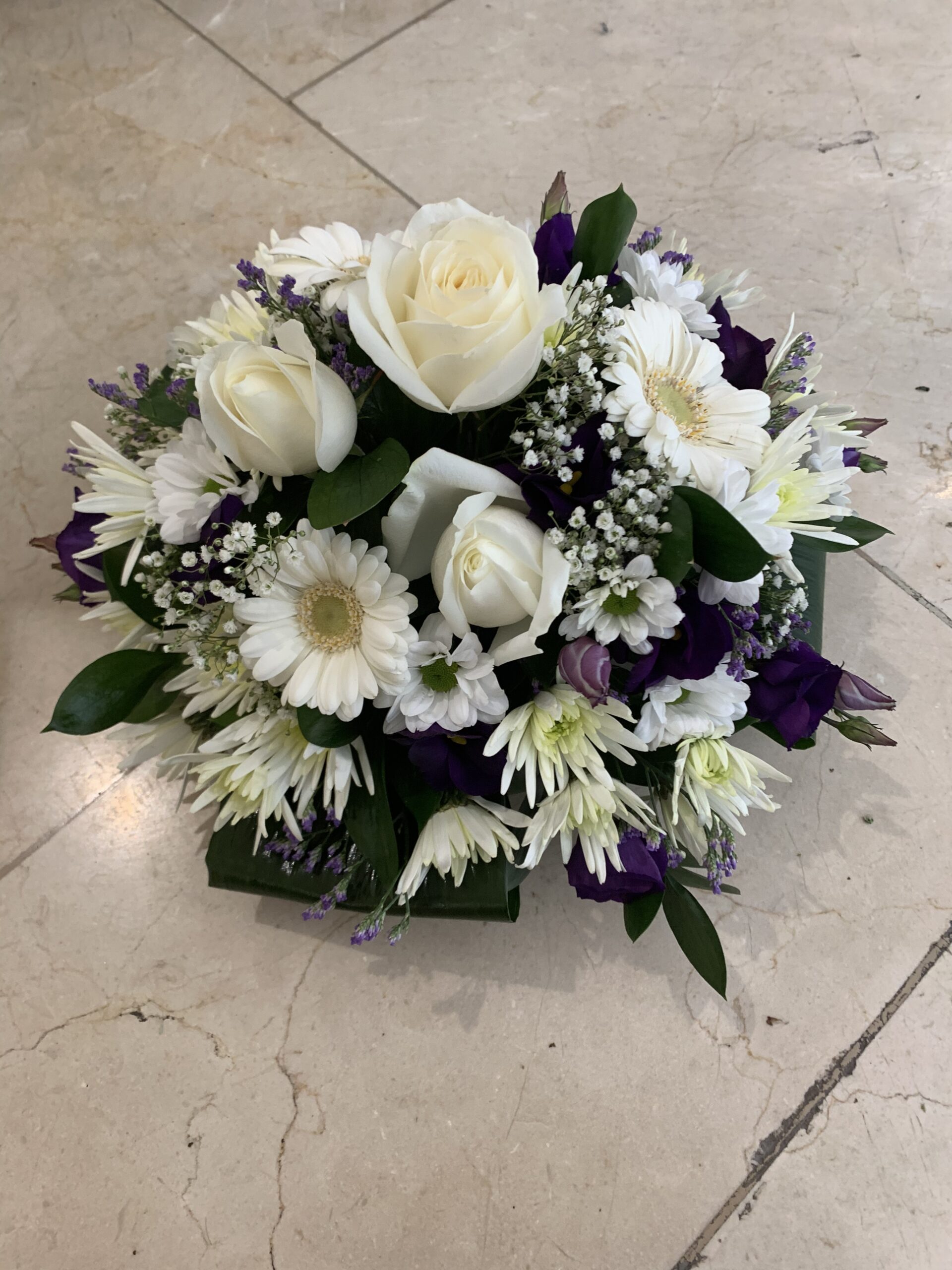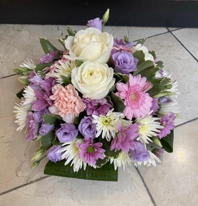 Funeral Flower Posy Tribute is a round dome in shape and full of mixed flowers such as roses, chrysanthemums, gypsophila to name a few and mixed foliages using your own choice of colours.