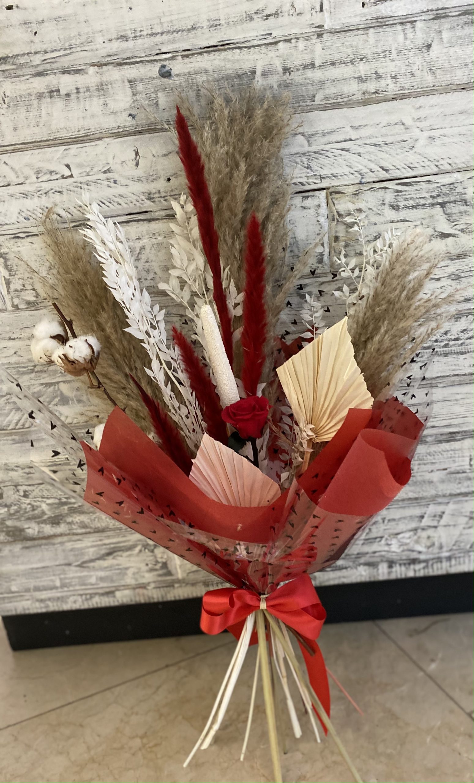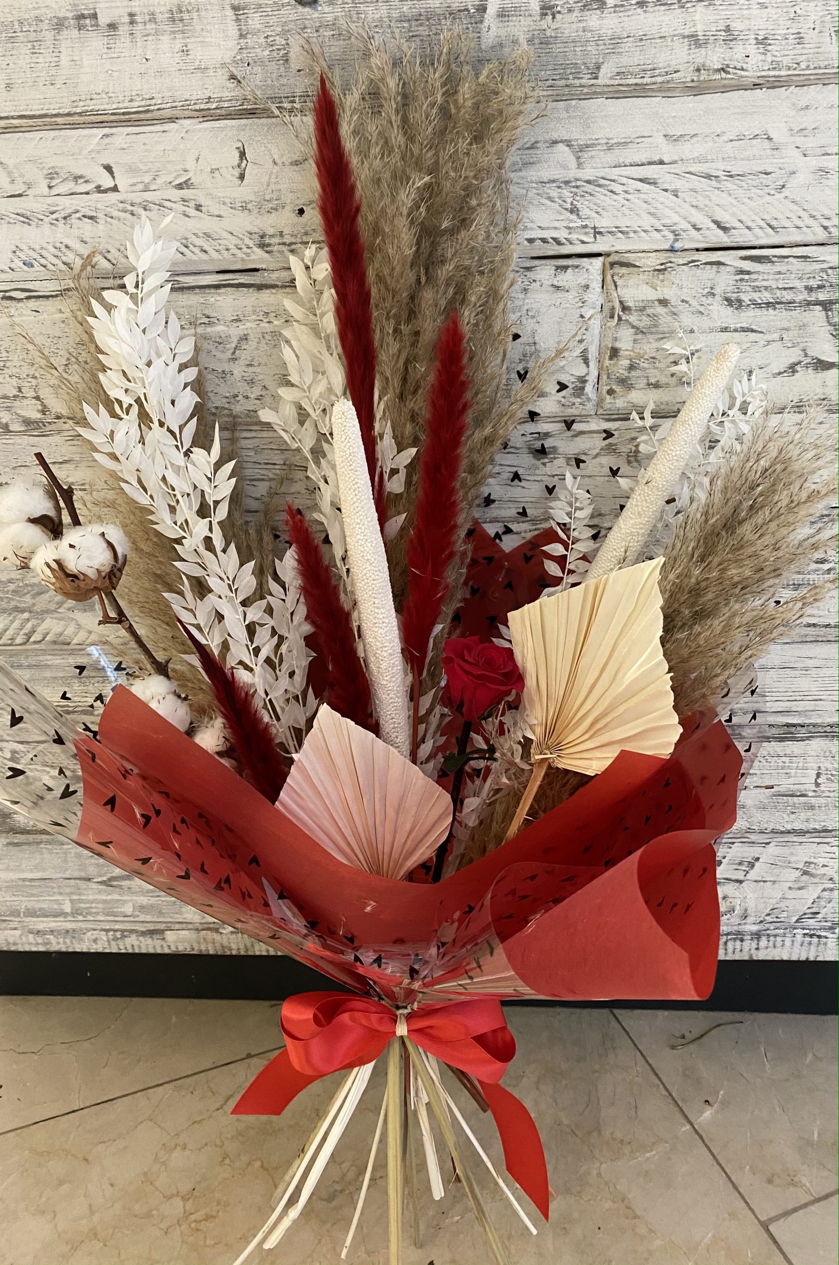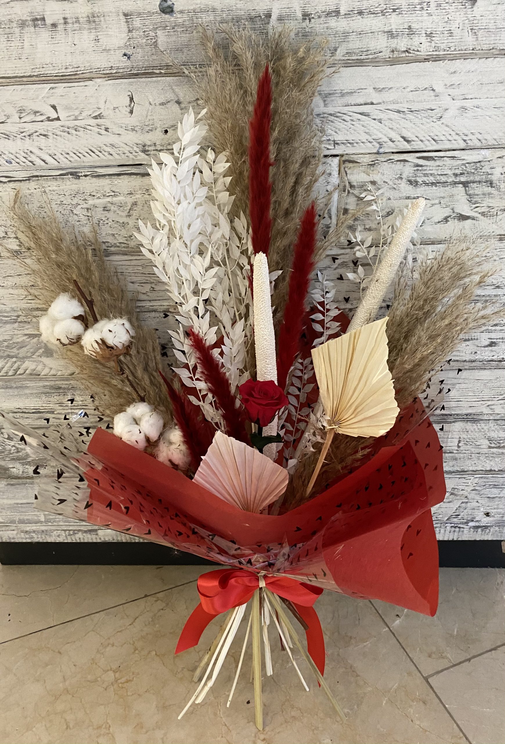Forever Red Rose Dried Bouquet-  This ice dried forever rose takes the centre stage, it has been specially treated to capture its true beauty. This is a REAL rose and will last for a year! We have introduced it to our beautiful dried flowers to give a unique spectacular design. Whoever is lucky enough to receive this stunning bouquet will not be disappointed.