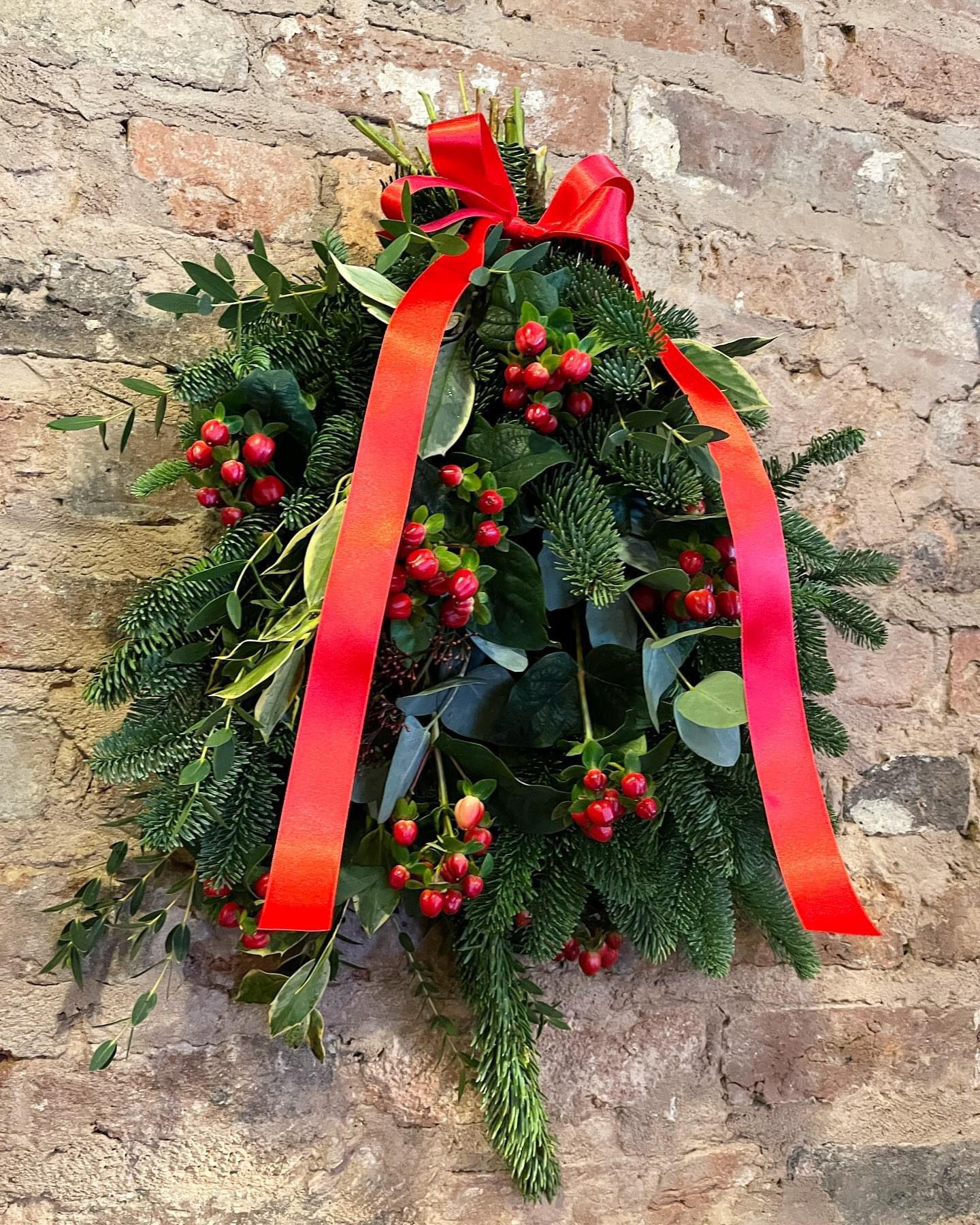 Looking for a Christmas door wreath with a difference! Why not order one of our beautiful Christmas swags! Let our talented florist hand-make yours using the most stunning winter foliages & berries and a beautiful long red satin ribbon draping down the length of the swag.
