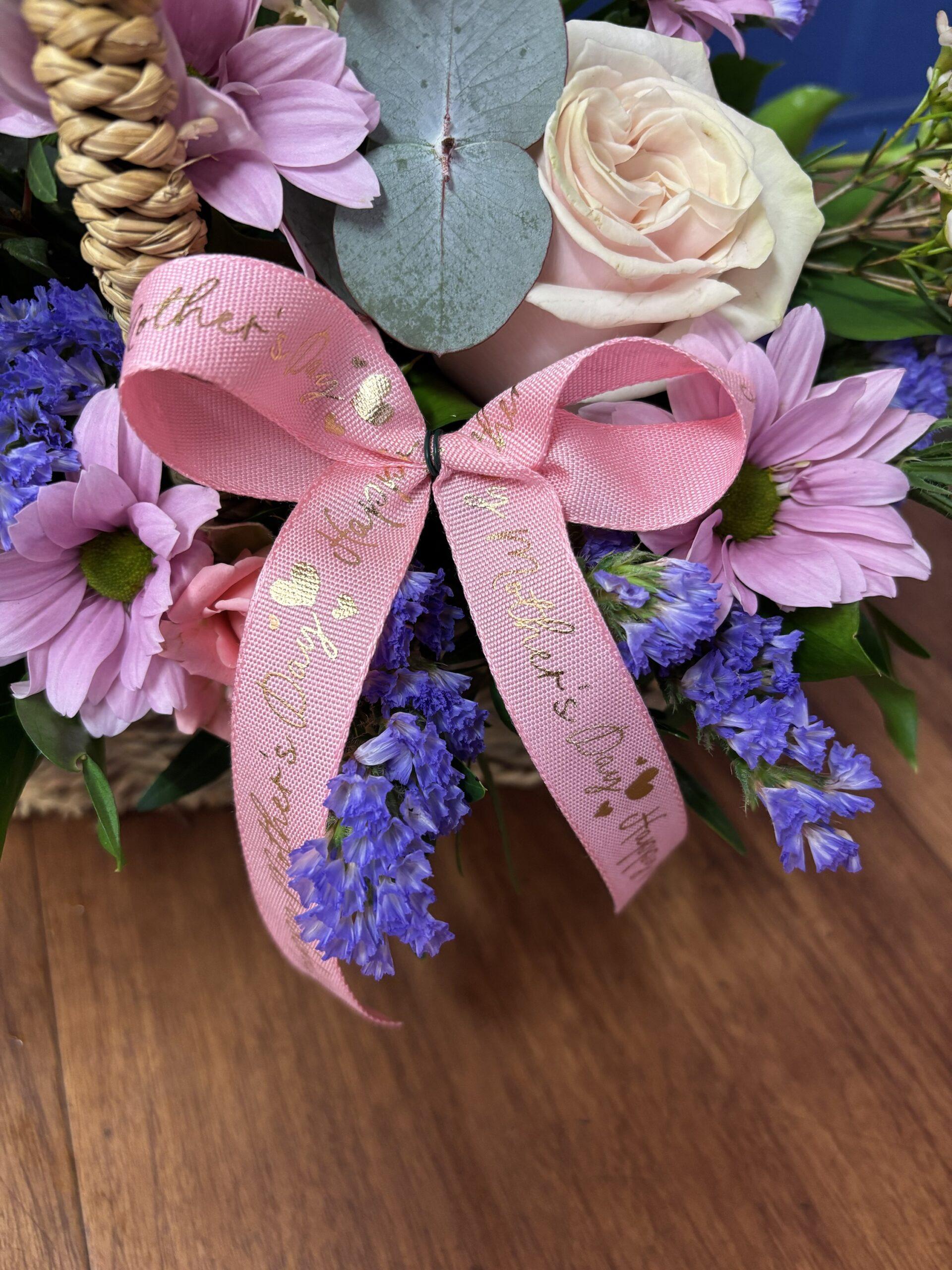 Beautiful Mother’s Day Floral Basket arrangement. Featuring beautiful mix of flowers in pinks, whites/creams and lilacs. Created in a rustic style basket with a ‘Happy Mother’s Day’ ribbon.