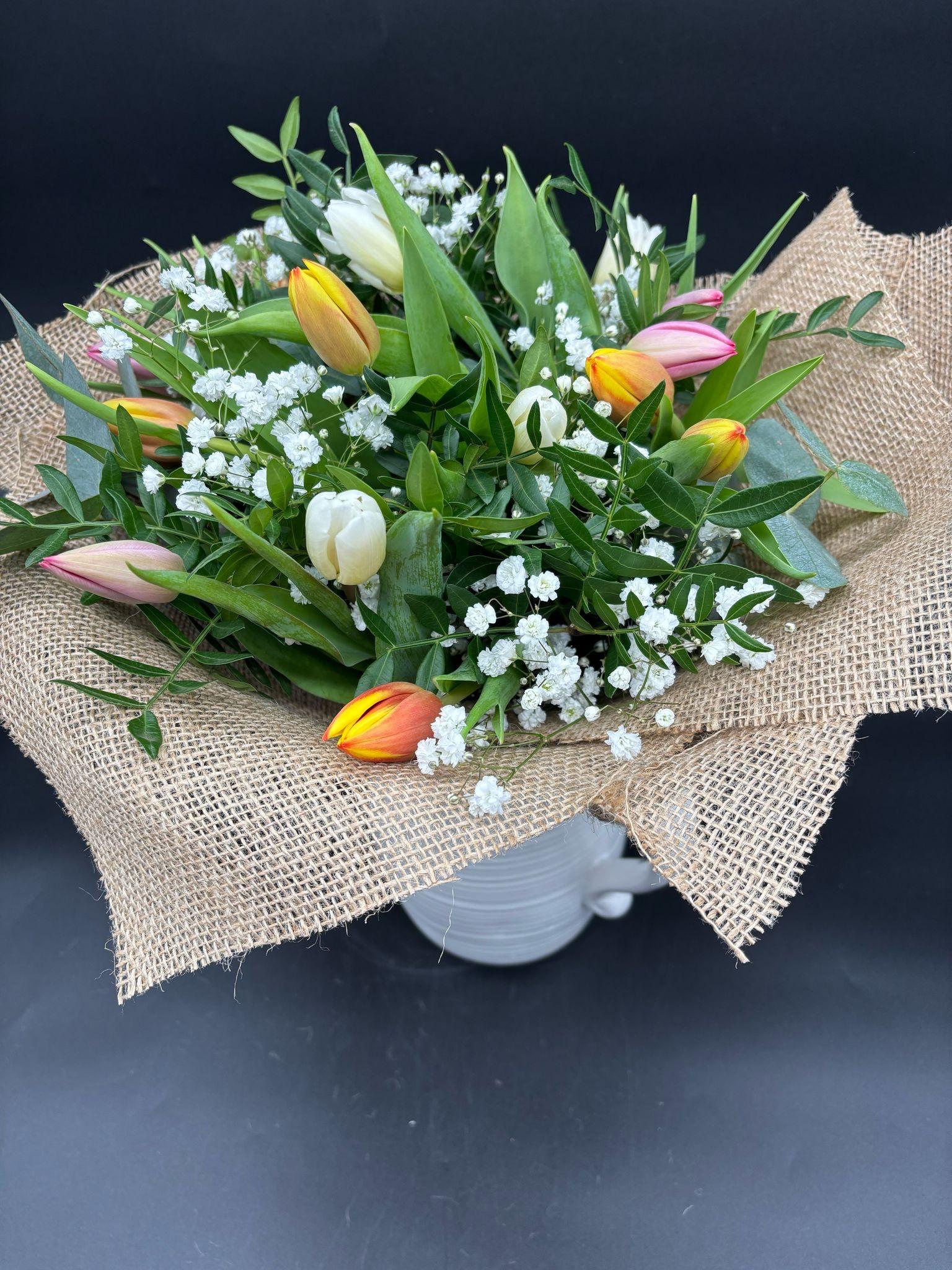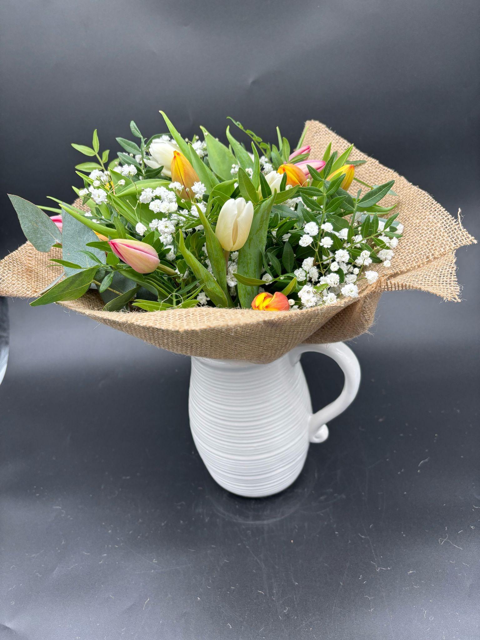 Mother’s Day Vase Of Fresh Tulips– fresh tulips, gypsophila and mixed foliage flower arrangement wrapped in hessian and presented in a lovely ceramic jug.