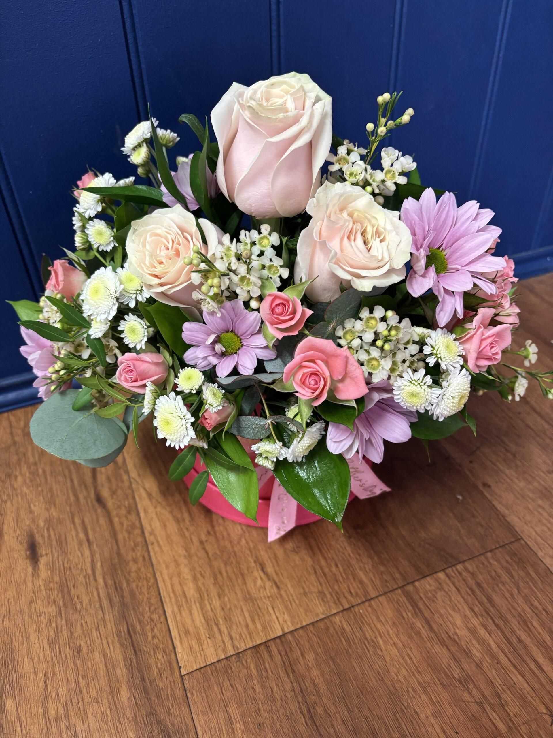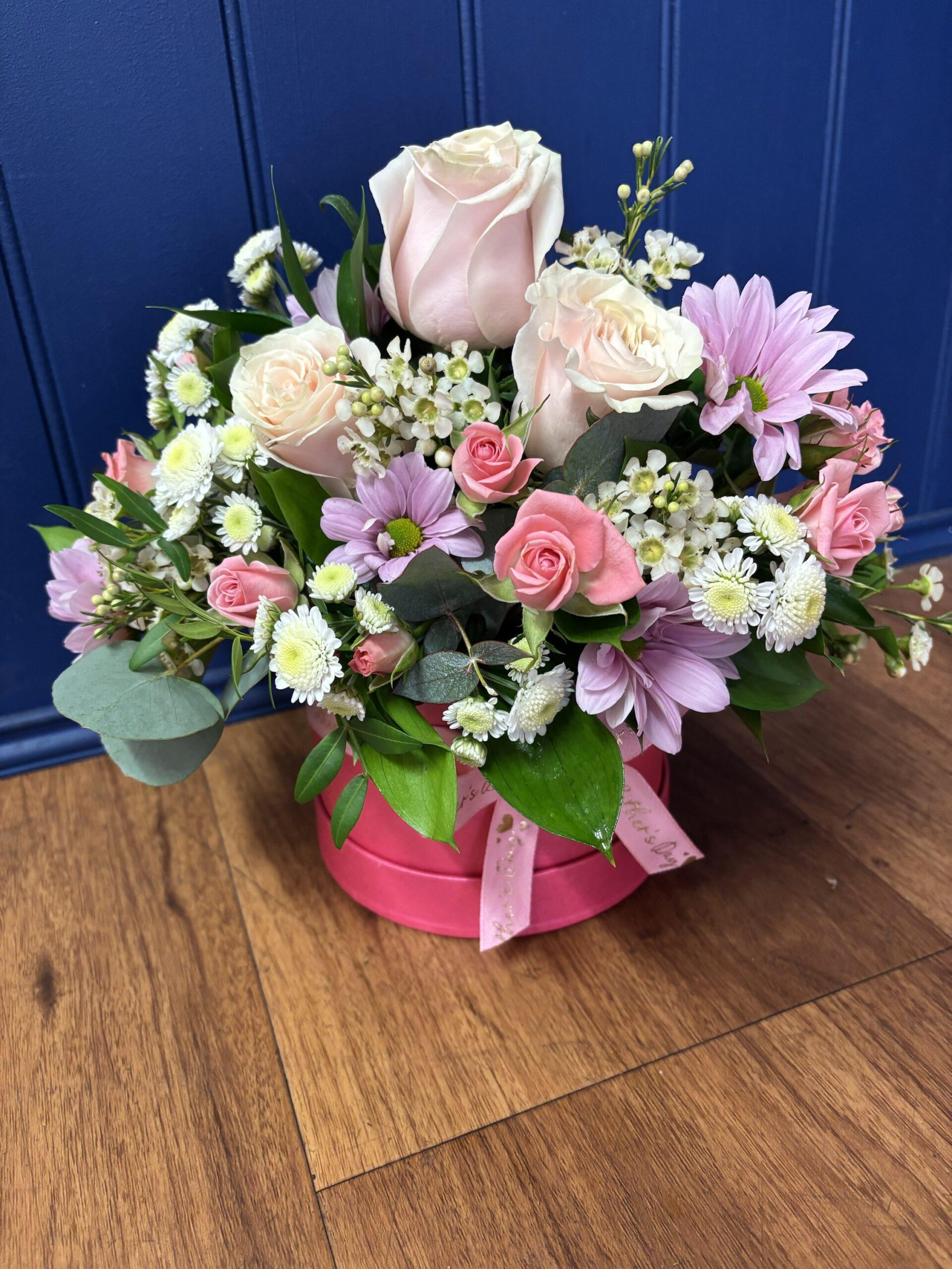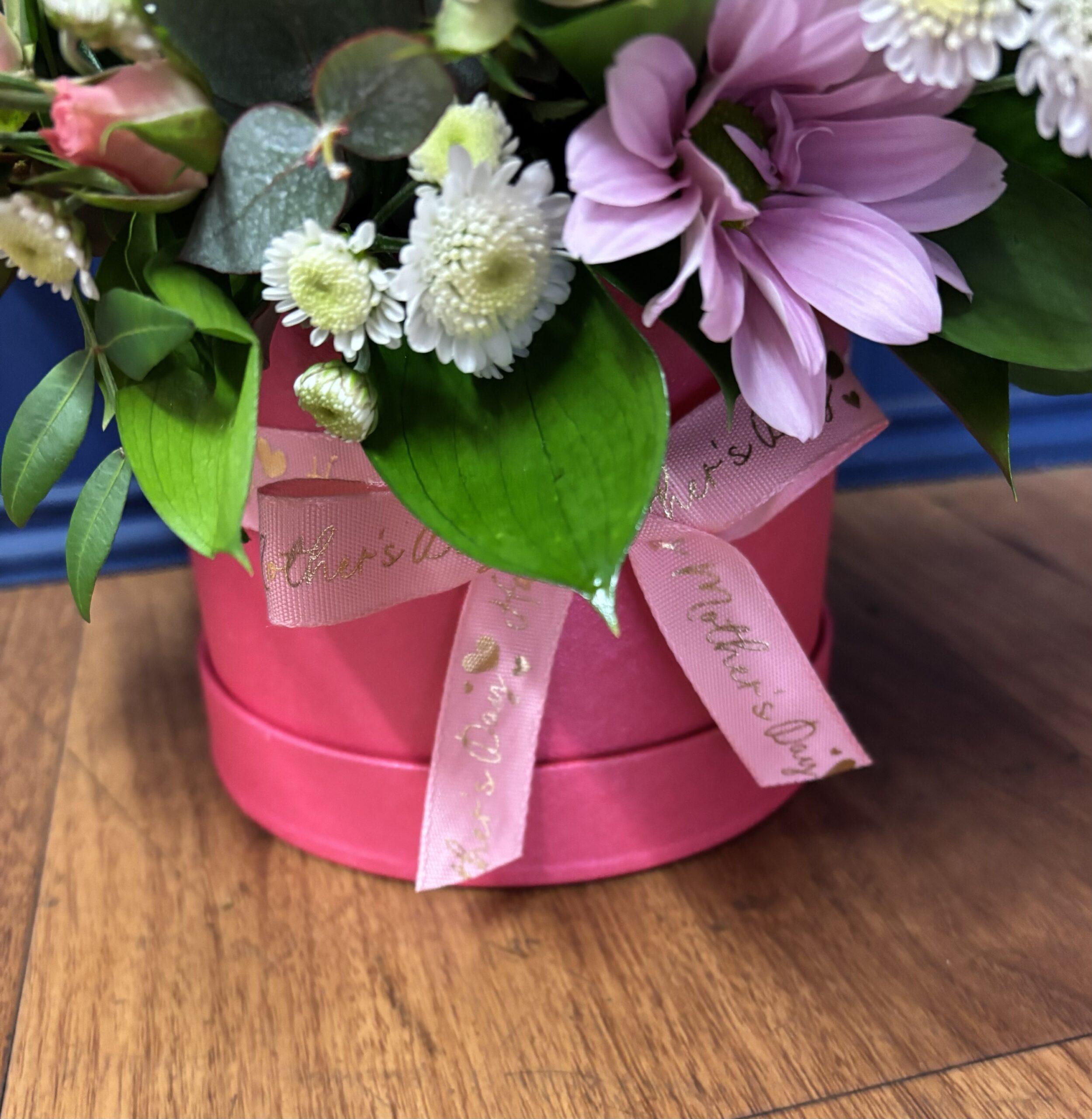 Mother’s Day Flower Hatbox-This hatbox is bursting elegance with beautiful pink, white and cream colours including roses, spray roses, gypsophila to name a few. A very modern flower hatbox with beautiful has mixed green foliage including the lovely eucalyptus and its stunning aroma which will fill any room.