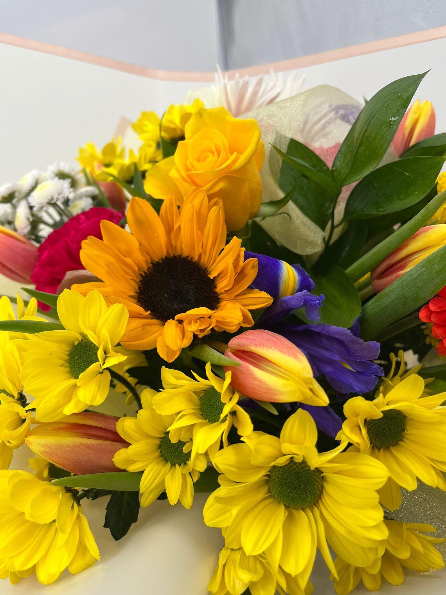 This bouquet really is a ray of sunshine ! Bright and beautiful, it’s bursting with all our favourite flowers of spring -Tulips, sunflower, iris, beautiful golden yellow chrysanthemums and more! All skilfully presented.